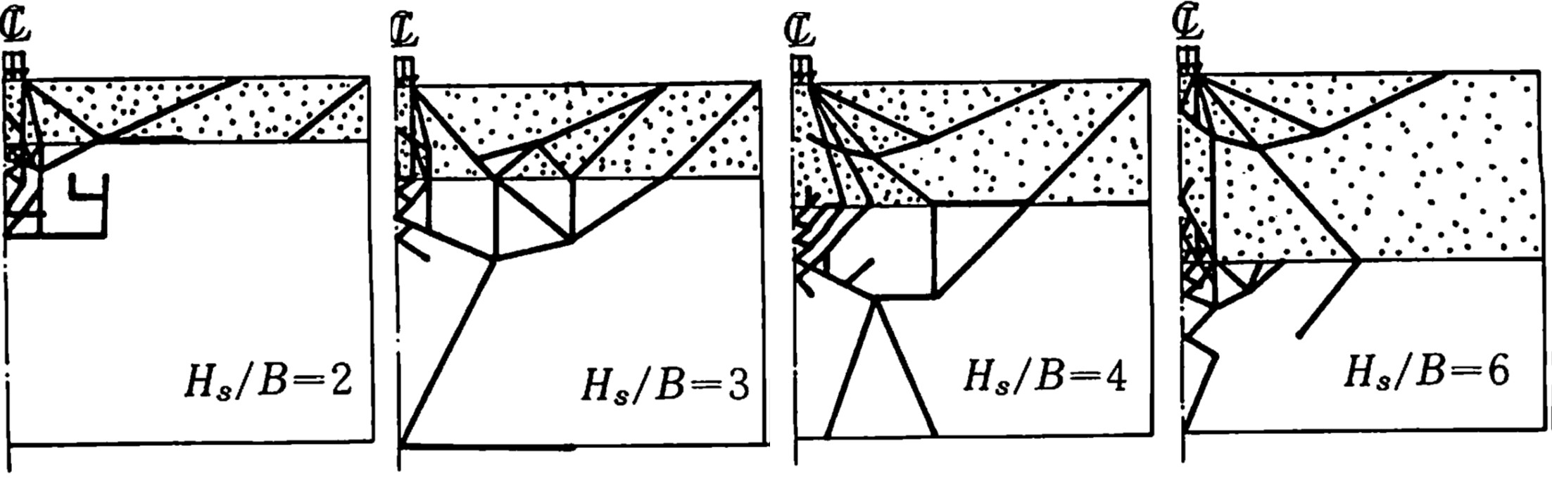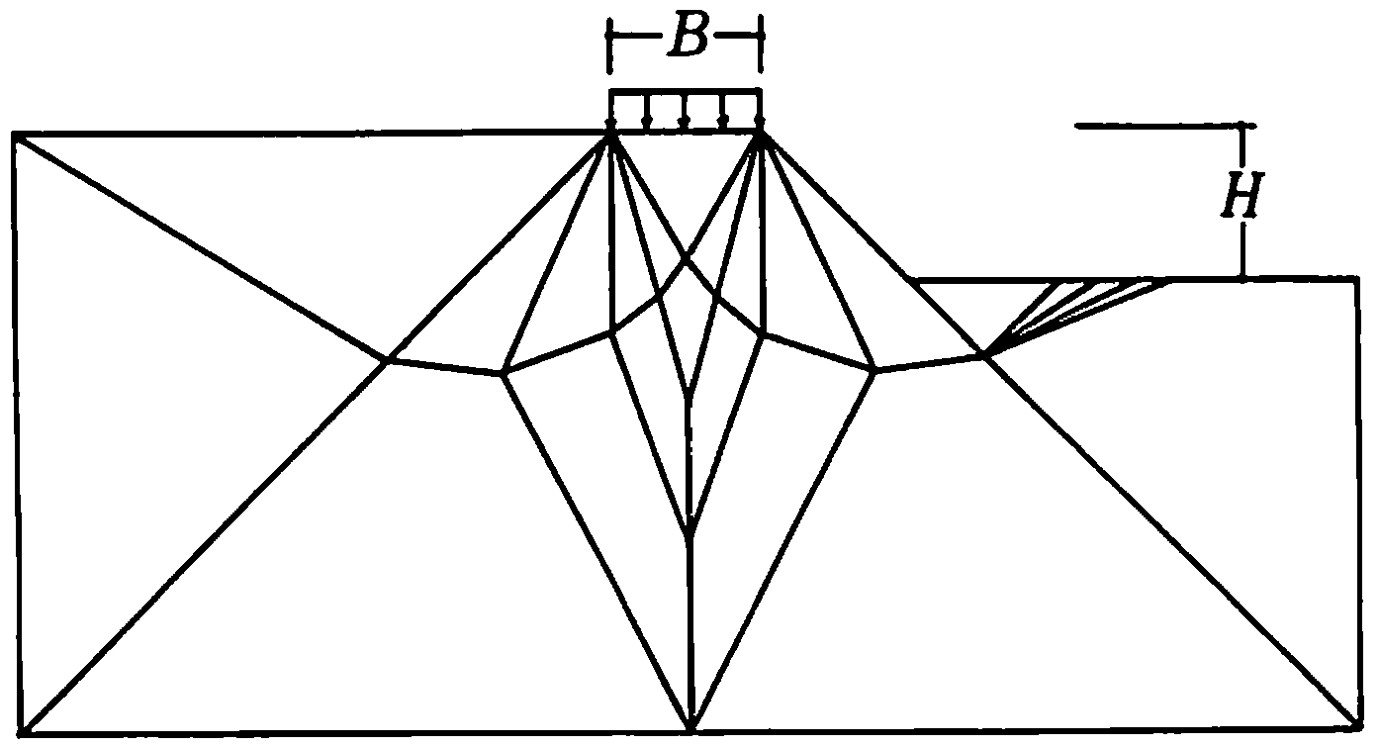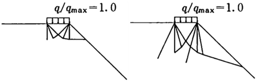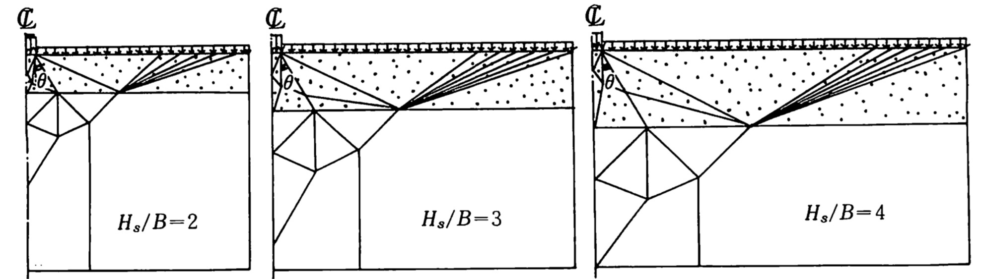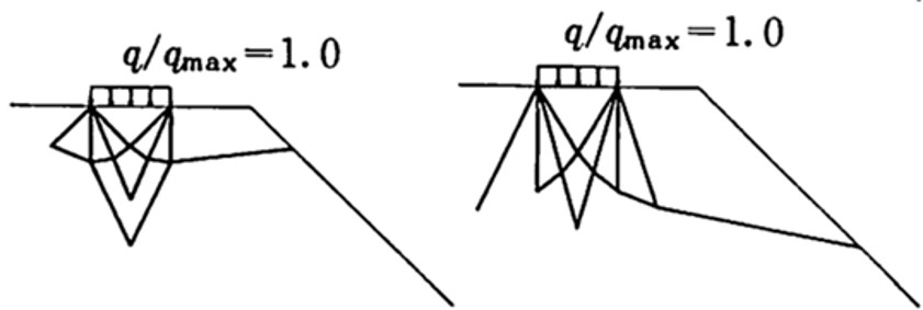 斜面高と基礎幅の比 $(H/B)$ がさらに小さくなると、斜面内にあったすべり線は斜面下に移動する。この場合、先の支持力公式は適用できなくなる。一方、$H/B=O$ の場合(水平地盤)についてはTerzaghiによって支持力が求められている。
