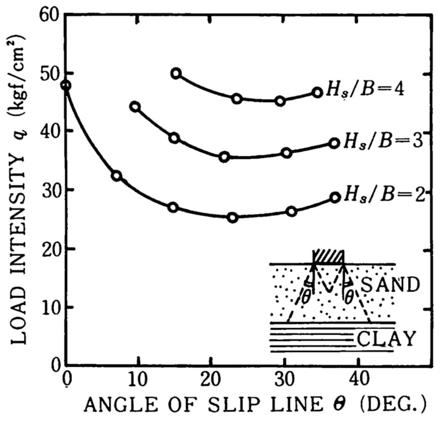 図4.14は横軸に $\theta$、 縦軸に破壊荷重をとり、これらの計算結果を整理したもので、崩壊荷の最小値を与える角度 $\theta$ は砂層厚の変化にもかかわらず $20^{\circ}~30^{\circ}$ の間にあることがわかる。