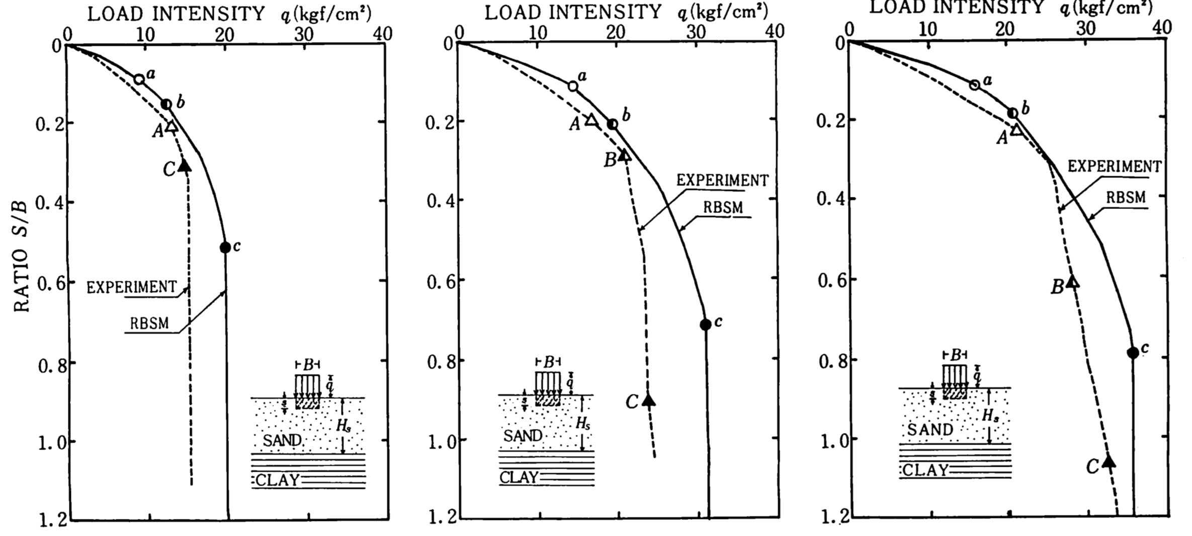 図4.9は上層が砂層、下層が粘土層で構成される2層系の地盤を表している。この2層地盤における実験結果と川井モデルによる解析結果を比較してみよう。実験では平面ひずみ条件のもと、上載圧 $1.0 {\rm kgf/cm^2}$ を図のように作用させている。解析では実験条件を考慮し、図に示すような材料定数ならびに上載圧を設定した。ただし、土の自重は無視している。非線形解析法は荷重増分法における山田の方法を利用し、破壊条件はモール・・クーロンの条件を用いた。また、応カーひずみ関係は完全弾塑性としている。載荷の順番は、上載圧を作用させ初期応力を求めた後、支持力としての荷重を作用させている。