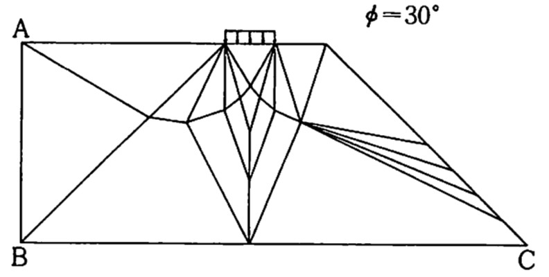 図4.1 に示すよう、閉じた解析領域を設定する必要がある。このため、得られる解に境界の影響が含まれるのを避けることはできない。しかし、川井モデルではメカニズムを形成するすべり線の塑性仕事を評価して極限荷重を求めているため、そのすべり線が領域内に含まれていれば少なくとも支持力値に関しては領域の広さに関係しない。Kotter式によれば、載荷重の傾斜角が小さく、内部摩擦角が $30^{\circ}$ 前後であるなら、すべり線の横方向の広がりは基礎幅の3倍から4倍程度となる。もし、内部摩擦角が $0^{\circ}$ で、自重がなければ基礎幅と同じ広がりになる。