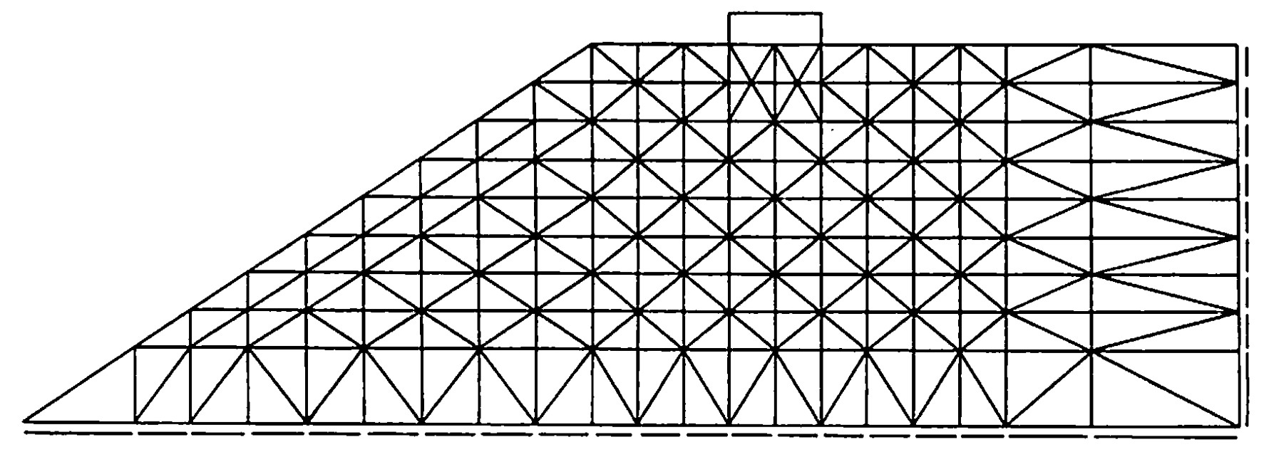 図4.10 に示すようにそれらを含む要素分割を行っておくことが必要である。川井モデルによる離散化極限解析ではこれらの中から最良のすべり線パターンを計算する。
