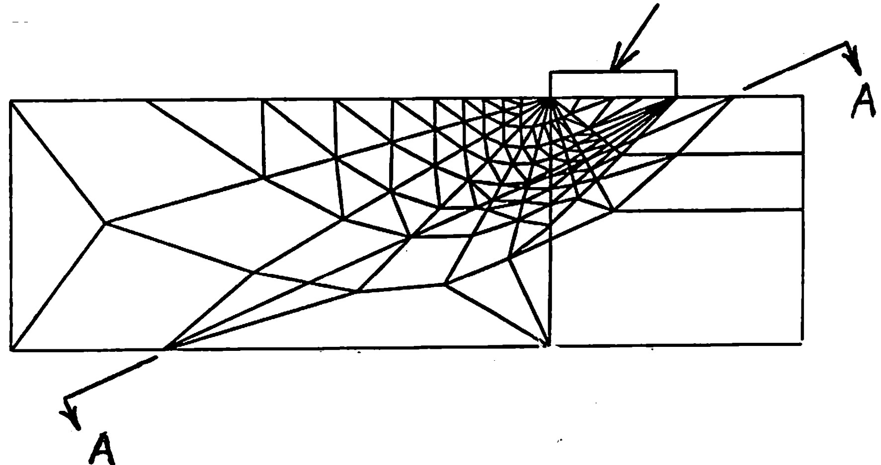 図4.3はA-A断面以下が支持層で、傾斜荷重を受けた場合の要素分割例である。全体的に傾斜方向を中心に要素分割が行われている。