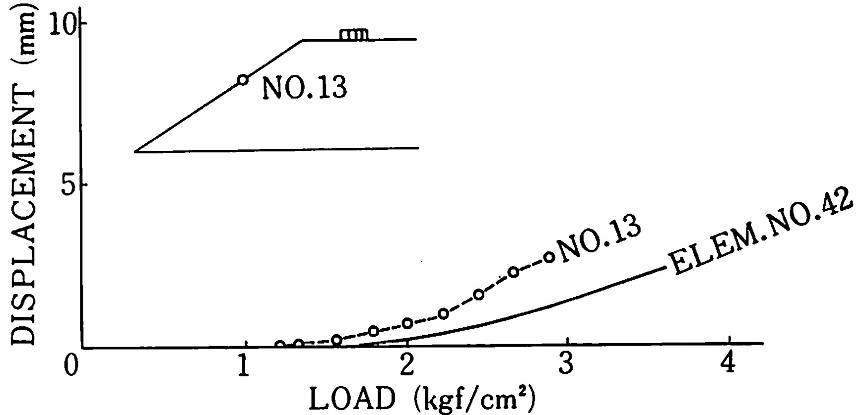図4.31 はNo.13に着目し、横軸に載荷重を、また、縦軸に垂直変位をとりプロットした結果である。荷重レベルに応じて垂直変位が増加する傾向かよく現れている。