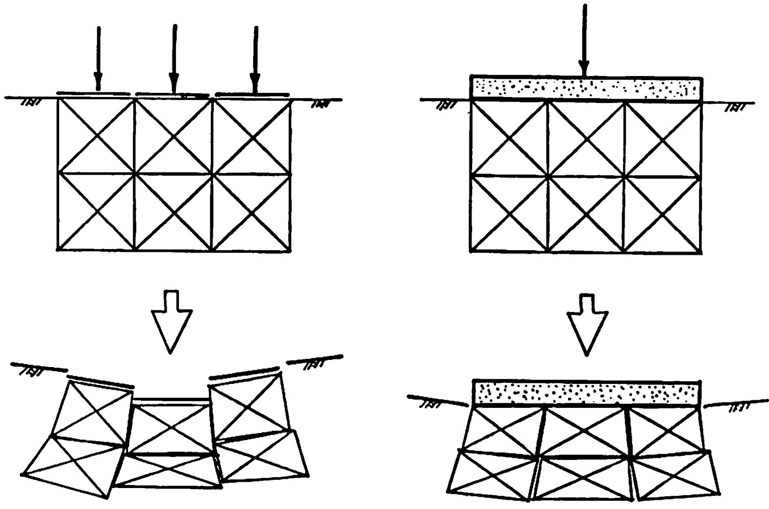 図(a)のような変形モードとなる。傾斜荷重が作用する場合にはこのような載荷方法はあまり適していない。このため、状況にもよるが、