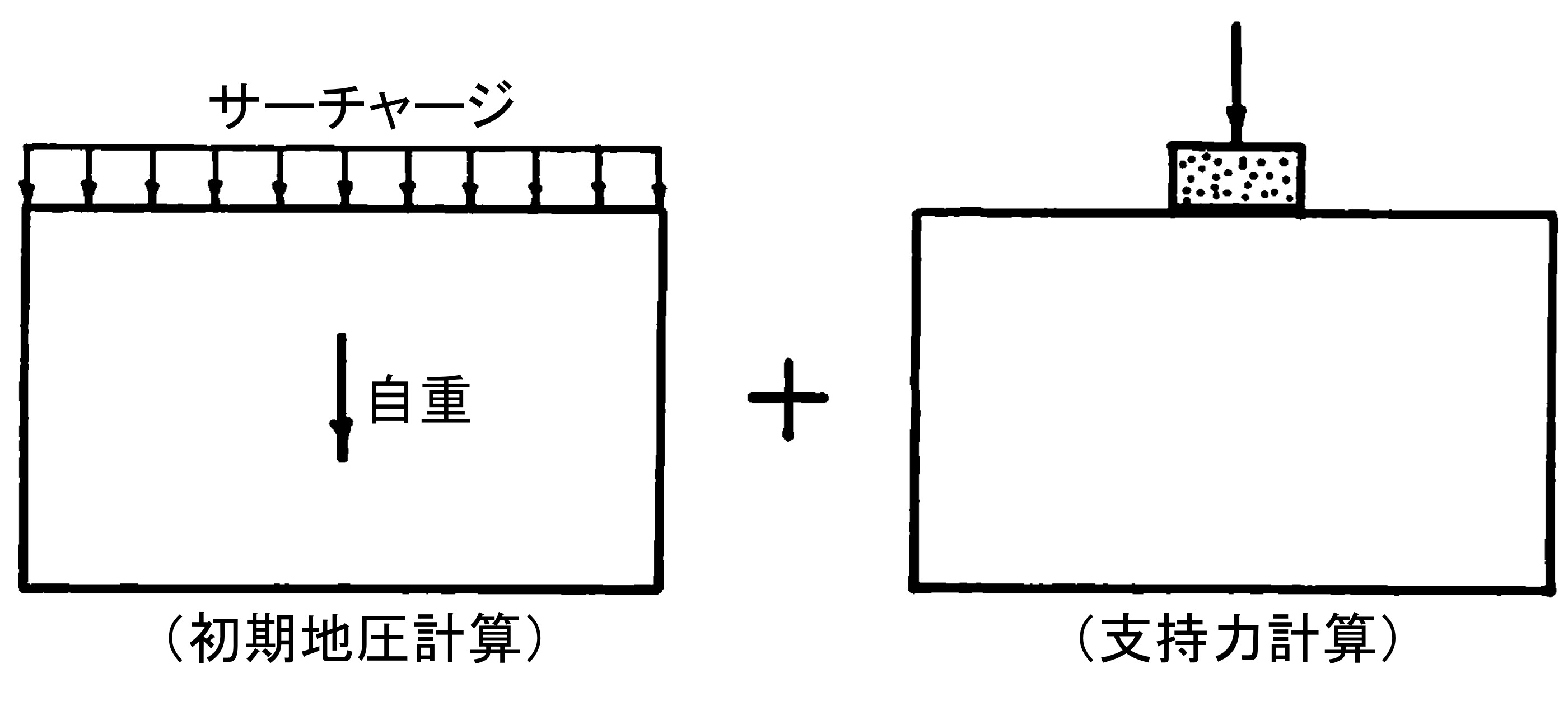 図4.5に示すように予めこれらを作用させた後、支持力計算を行わなければならない。特に、非線形解析法として荷重増分法を利用する場合は同時に計算すると自重などにも荷重増分率がかかってくるため、正しい支持力値が求められないこともある。