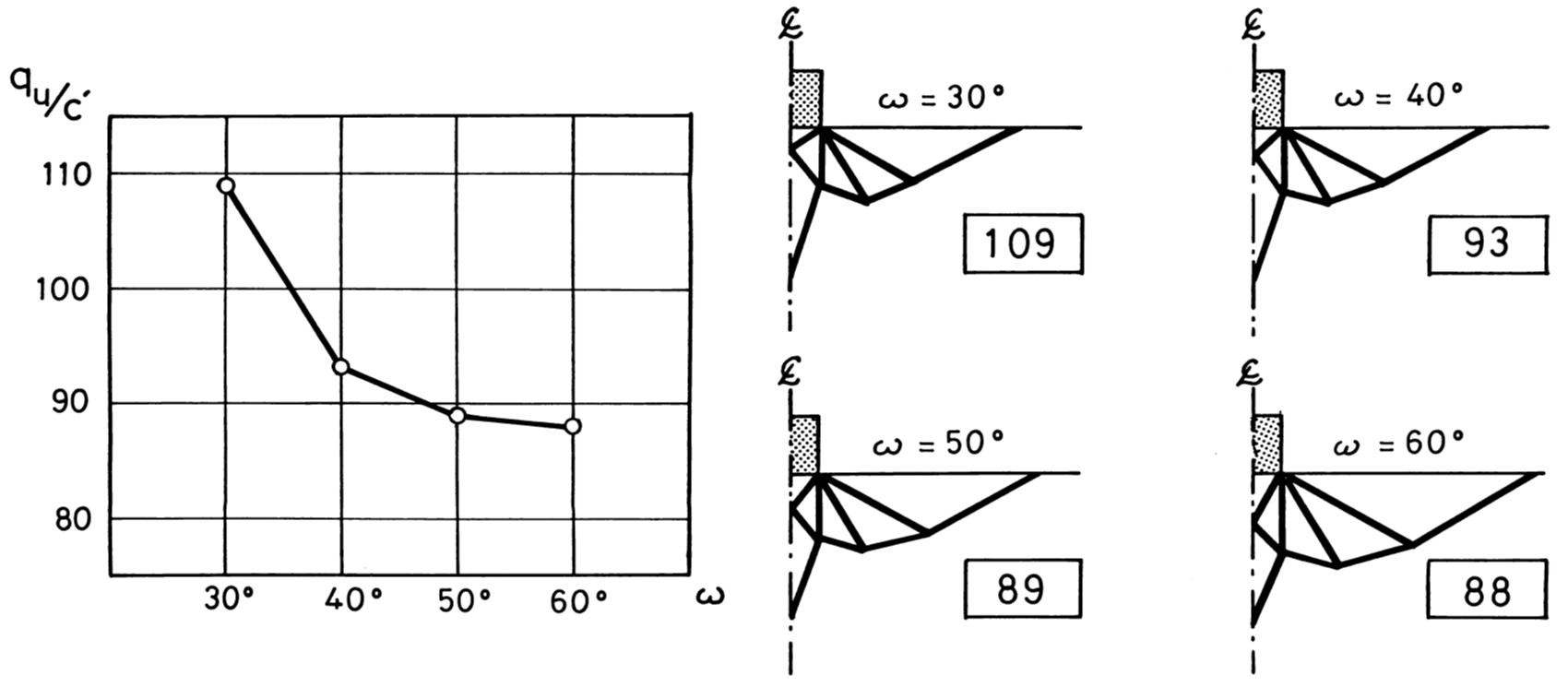 一方、実験的には基礎底面の粗滑に関係なく $\omega=\pi/4+\phi/2$ に近いことが確かめられている。Caquotは、この実験事実に基づき以下の支持力係数を提案している。
