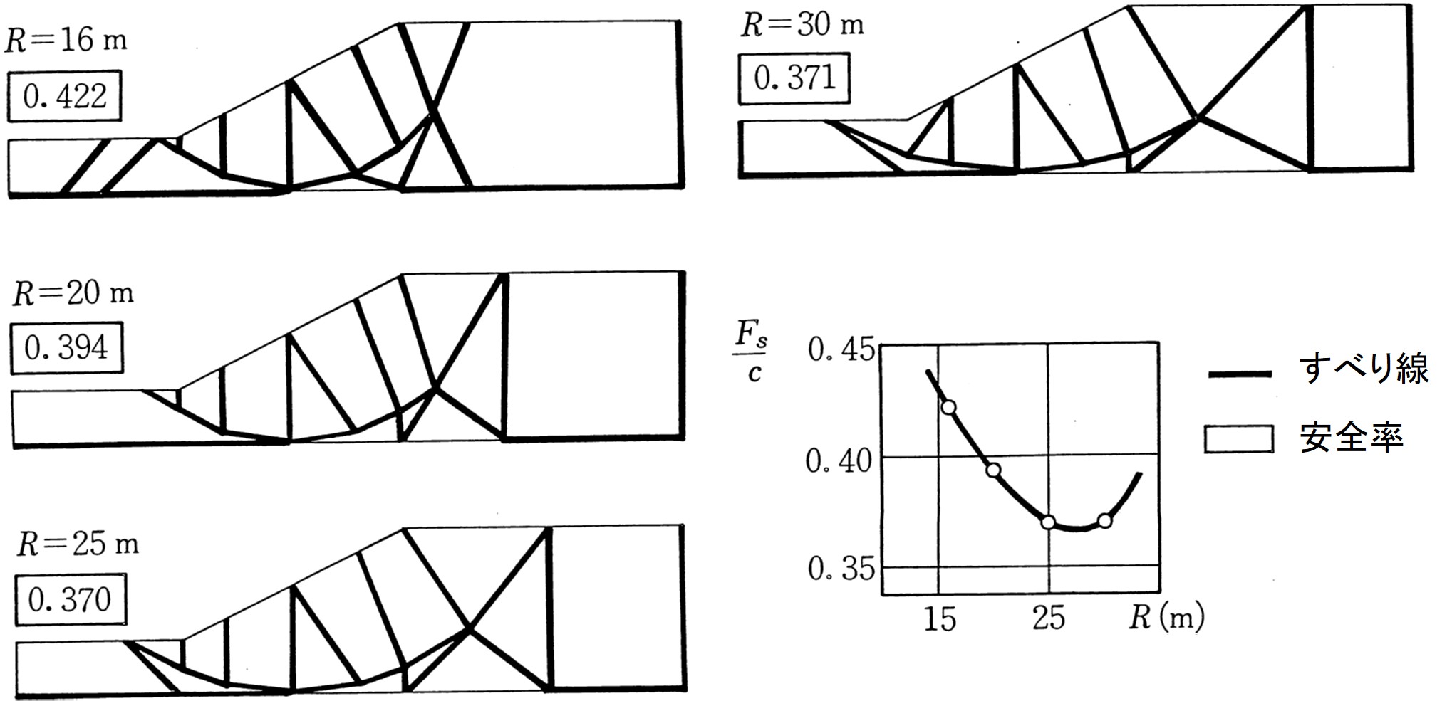 $\hspace{8em}$図5.11 $R$ の変化によるすべり線と安全率