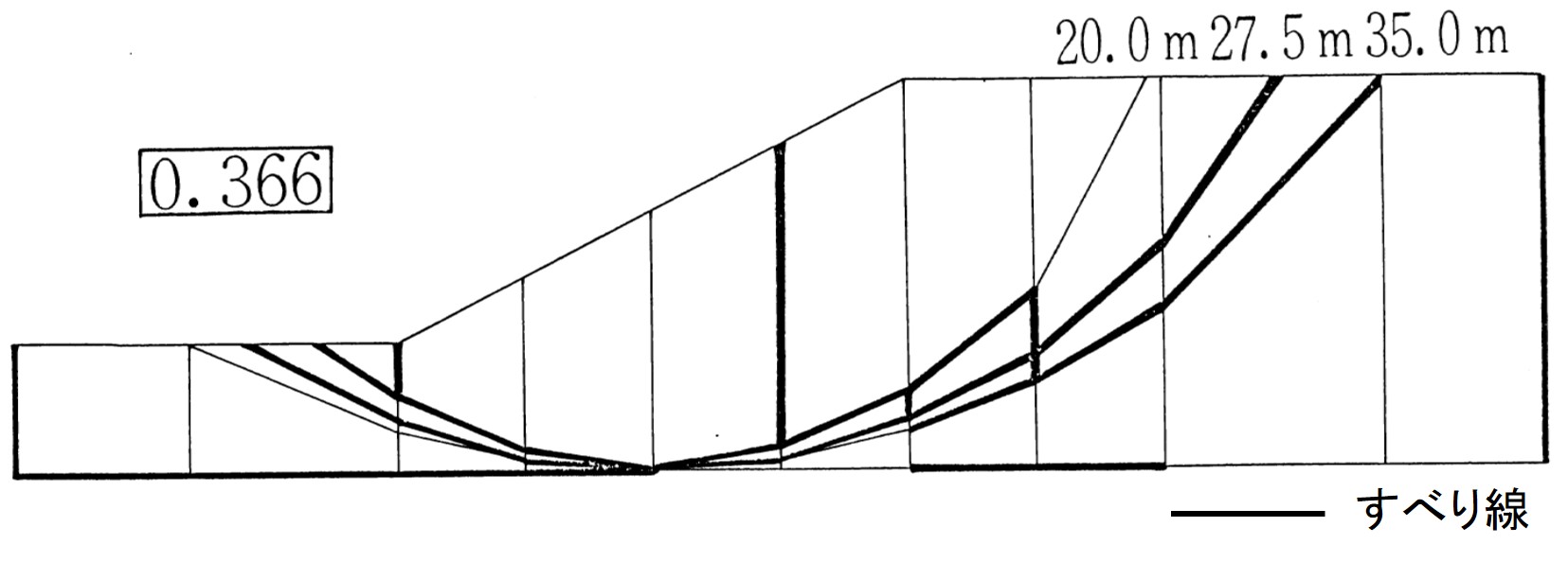 図5.12に示されるように、半径が $20、27.5、35 \; {\rm m}$ の円弧が含まれる極端な要素分割を行い、どのすべり線が卓越するか解析した。すべり線の状況は $27.5 {\rm m}$ の円弧より小さい円弧では斜面前方が破壊しやすく、逆に大きな半径の円弧では後方がすべりやすいという結果となっている。最も危険であると予想された $27.5 {\rm m}$ の円弧では全面にわたりすべり線が発生し、このすべり線によって斜面は崩壊する。このときの安全率は、先の安全率からも推測できるように0.366という値であった。