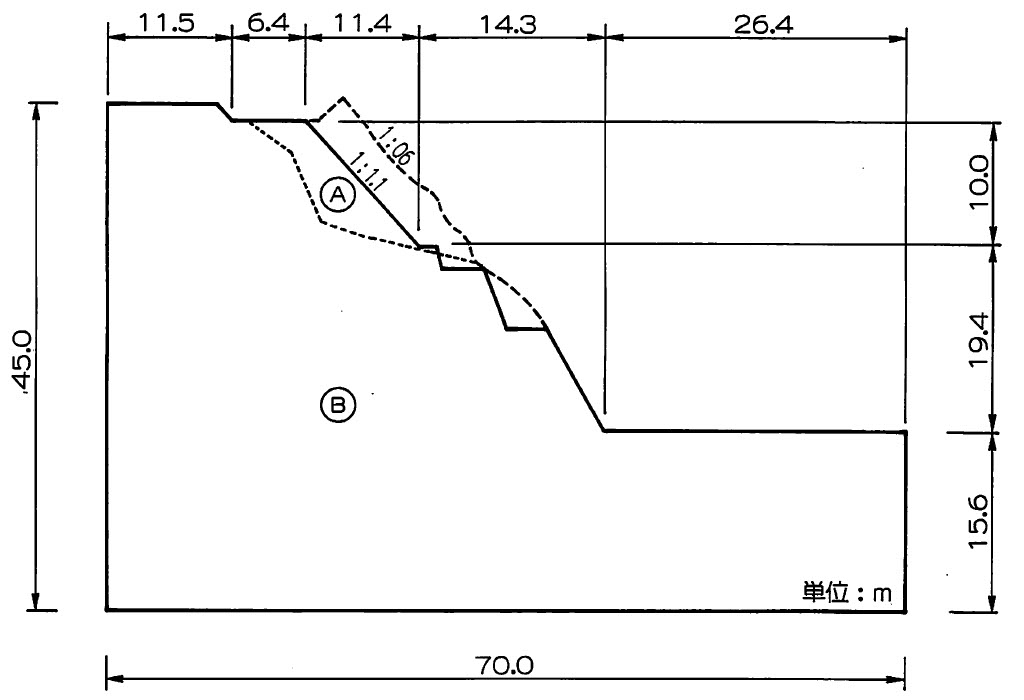斜面安定解析を有限要素法や川井モデルなどのような領域型解析法を用いて行う場合、最も注意を要する点の1つとして解析領域の決定がある。支持力問題の場合、基礎周辺を中心にし、前章で示した考え方により領域を決定すれば比較的良好な解を得ることができるが、斜面安定解析の場合は明確な領域決定法はない。自然に存在するような斜面の場合、解析領域としてかなり広い範囲を設定しなければ良い解が得られないことも度々ある。このような場合、過去の計算結果を参考にするのも一つの方法である。
