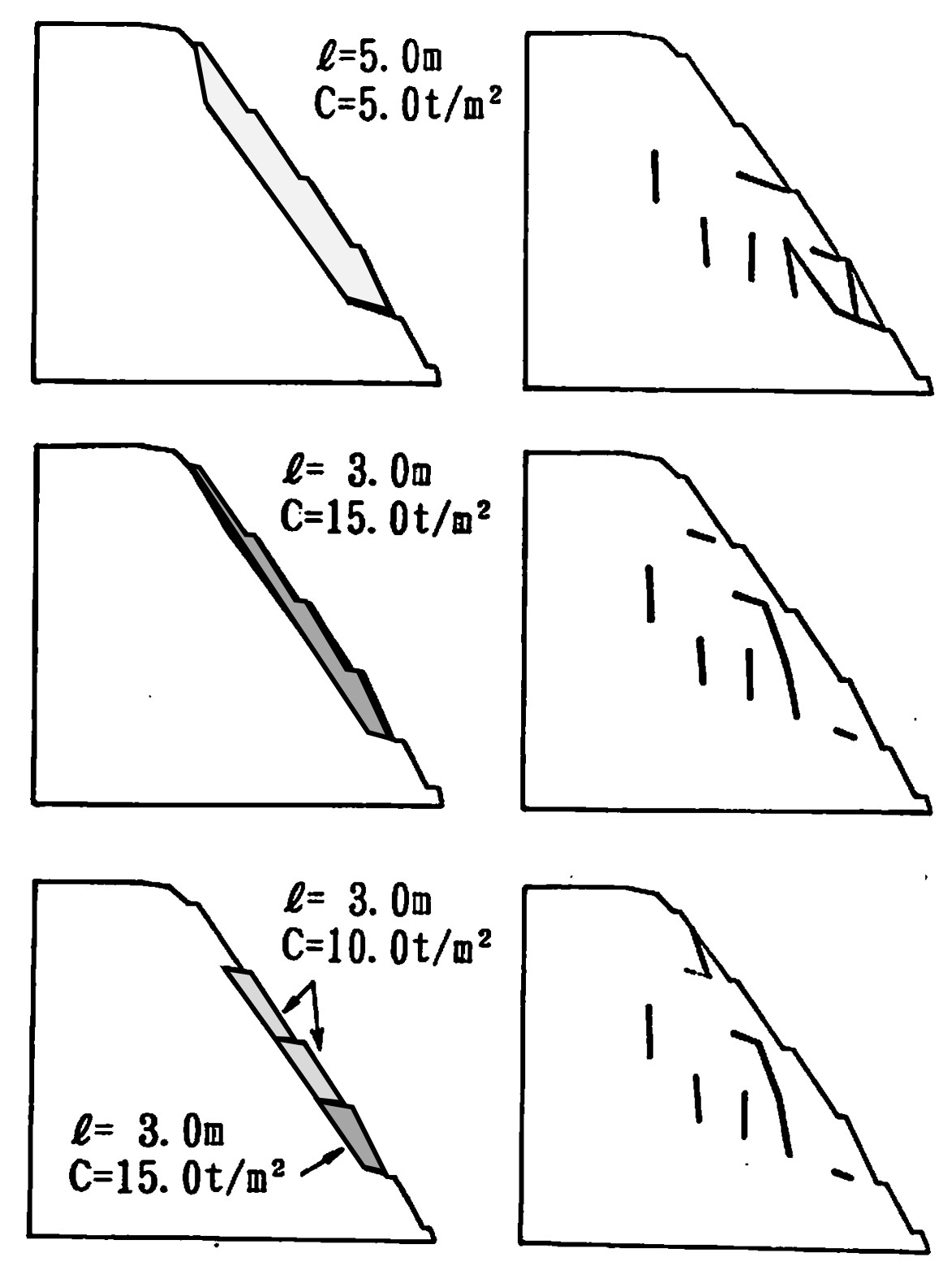 図5.24はロックボルトの本数や長さを変えて計算した結果が示されている。上段は長めのロックボルトを少なめに入れた場合の結果で、図右に打設状況、左にすべり線が示されている。この場合、斜面底部に法面を横切るすべりが発生しており斜面崩壊の危険性は高い。中段は短めのロックボルトを数多く打設した場合で、すべりは斜面深部にのみ発生するため、崩壊の危険性を回避することができる。下段は同一長さのロックボルトを斜面位置に応じて本数を変え打設した場合の結果である。中段の結果とほぼ同じであり、経済性の高い打設方法であるといえる。