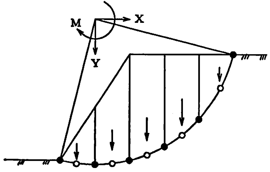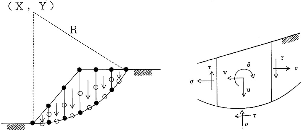 以上の方法は円弧を1要素で考えているため、細片分割間に生ずる不静定カを扱うことができない。一般的には、法肩に引っ張り破壊が生ずることも多く、細片間に生ずる表面力を評価する必要がある。そこで、先の方法をさらに発展させ細片間の不静定力を評価できる方法について説明する。先の方法と同様、基本的な計算手順から説明しよう。