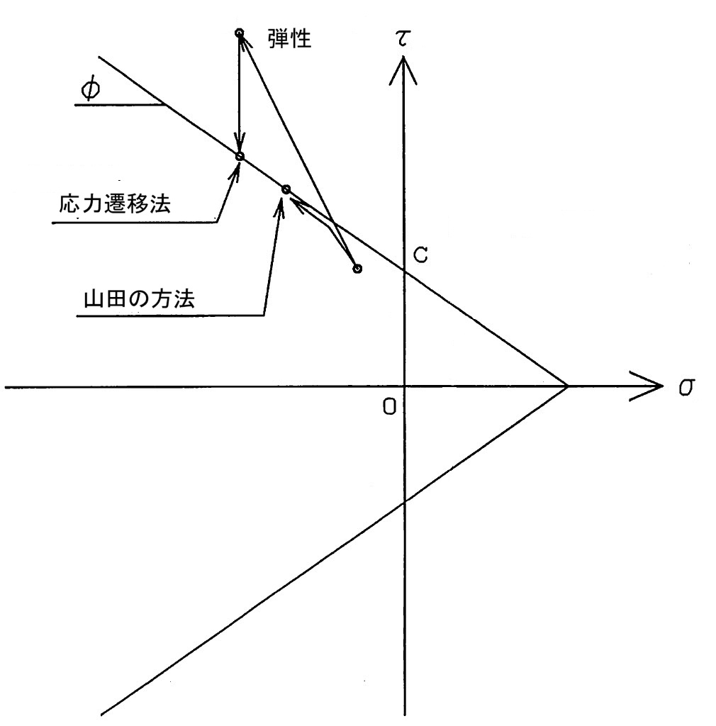 3.4節で説明した反復法により塑性計算を行う。破壊条件がモール・クーロンの場合、これら両者の関係は