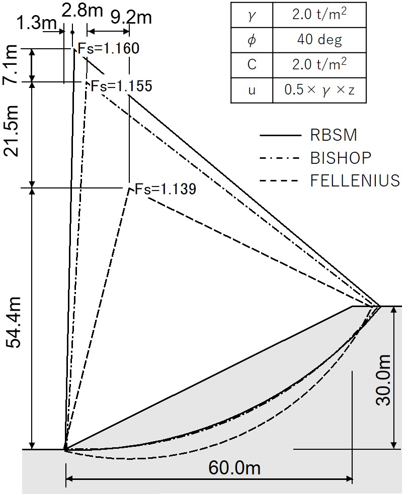 このようにして求めた斜面全体の安全率は、極限平衡法により求めた値より、一般的に高めの値を示す傾向にある。