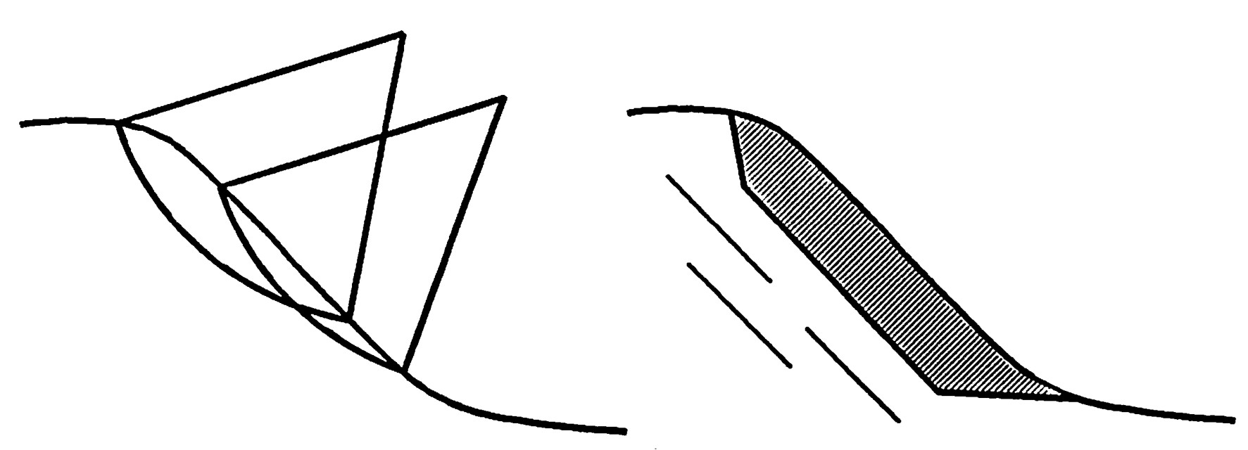 図5.21は節理系の地盤をモデル化したものである。風化の進んだ堆積岩では図のような層理、節理が発達し、層理面に沿ってプロック状に割れる場合が多い。このような地盤では切土に伴い法面が乾湿の繰り返しで風化が進み、節理・クラックなどの脆弱部のせん断強度が低下し滑落が生じている場合も多々ある。また、滑落した層理面は鏡状を呈することもあり、この場合はせん断抵抗がほとんど得られないこともある。