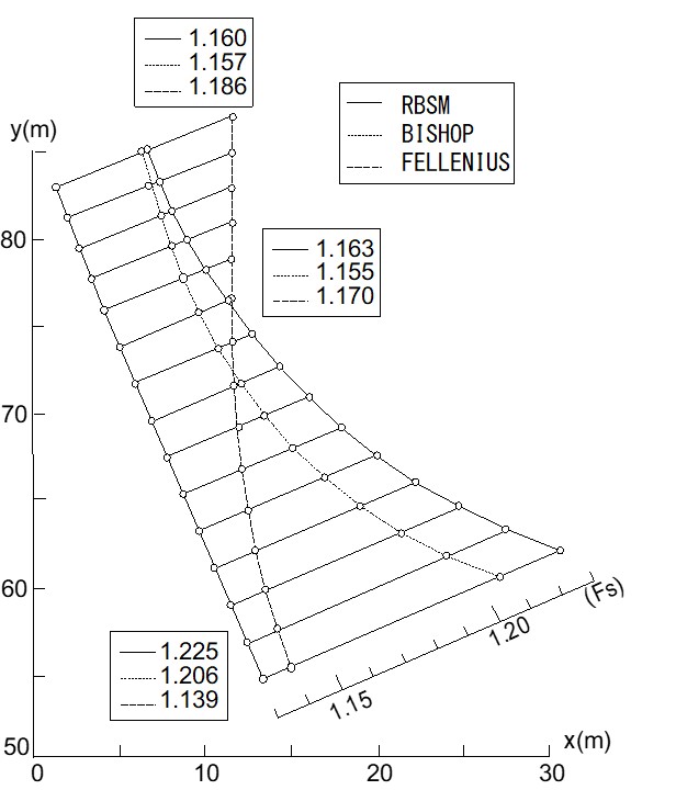図5.29は各々の方法により最小安全率を与える位置を求め、比較した図である。Bisbhop法とRBSMを比較すると円弧の中心は川井モデルが $(1.3{\rm m}、83.O{\rm m})$、Bishop法が $(4.1{\rm m}、75.9{\rm m})$ と比較的近い位置にあり、安全率も川井モデルが $F_s=1.160$、Bishop法が $F_s=1.155$ と同様な値を示す。一方、簡便法 (Fe! leniuse法)による最小安全率を与える円弧中心位置は両者と大きく異なり、安全率の値も小さくなっている