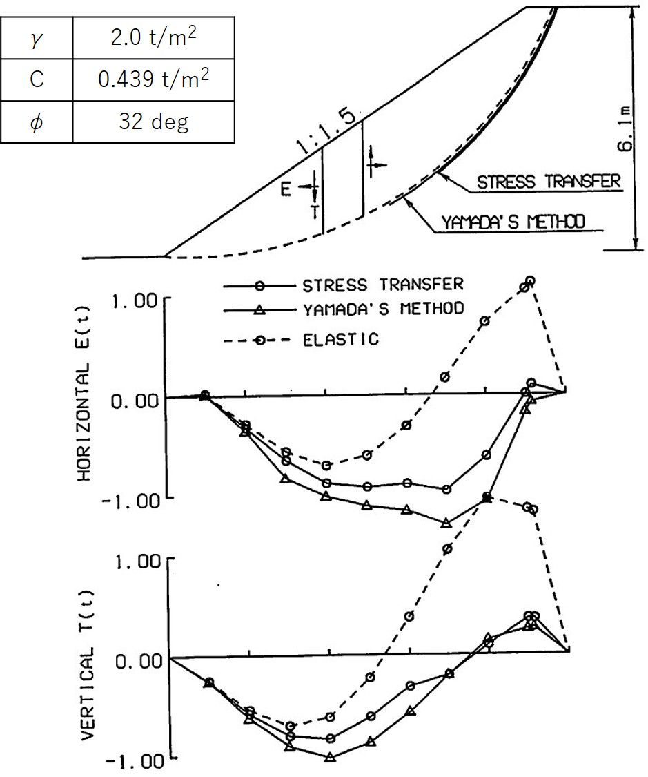 図5.32には計算に用いた均一斜面と反復法、山田の方法による塑性解析ならびに弾性解析による細片間の不静定力を比較した図が示されている。弾性解析では水平方向の力 $E$ が法肩に近づくに従ってかなりの領域で引っ張り力が発生しているが、塑性解析を行いすべりを発生させると、応力再配分によりこの領域が極端に少なくなる。山田の方法では、まったくなくなっている。また鉛直方向の力Tに対しても、弾性解析では極端なせん断力の変化が認められるが、すべりの発生により変化の度合いが緩和されている。これは、他の簡便法による結果と類似した傾向である。