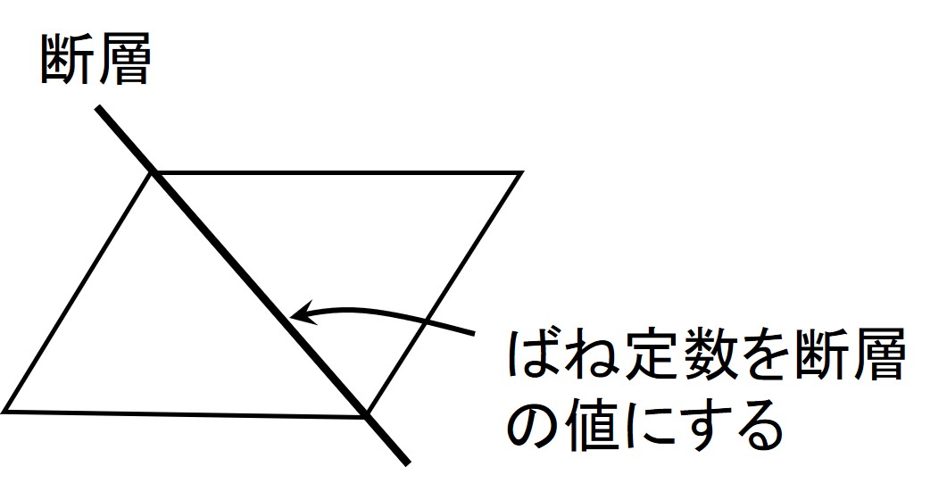 図5.5に示すように要素分割へ考慮することで、有限要素法においてよく利用されているジョイント要素などの特別な要素を挿入せずにすむ。ただし、断層部分に該等する要素境界上のばねについては
