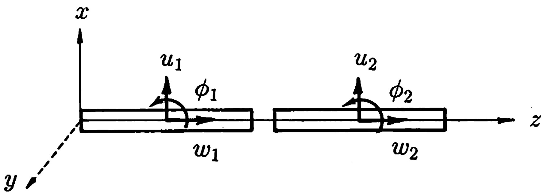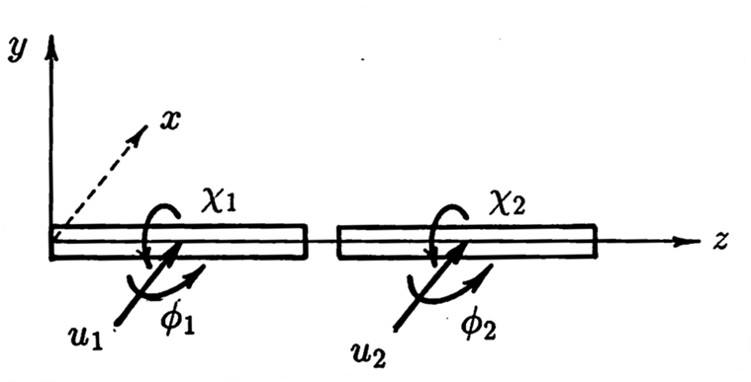 以上の関係は1章において示した座標系に従って誘導したものであり、質量は常に重心において評価するものと考えている。この場合、質量行列は集中質星行列となり、要素単位で作成することができる。