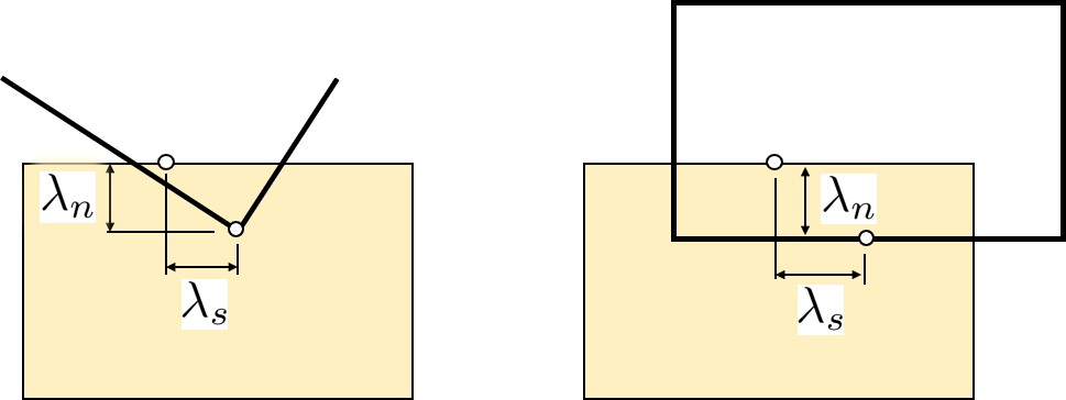 図2.1に示すように,$\left( \delta_n, \delta_s \right)$ は要素境界辺に対する法線および接線方向の相対変位で,同様に,$\left( \lambda_n, \lambda_s \right)$ は,法線および接線方向に対するLagrangeの未定乗数,すなわち表面力である.