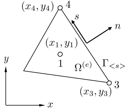 なお,係数行列 $\boldsymbol{K}_{\lt s \gt}$ において,要素境界面に関する積分が含まれるが,通常は数値積分により解析する.なお,Voronoi多角形など,多角形の複雑な形状の場合には数値積分の適用が難しくなる.このような場合,多角形を三角形の集まりに分割し,それぞれの三角形に対して数値積分を適用するという方法が提案されており,この方法を用いても精度に与える影響は少ないとされている.
