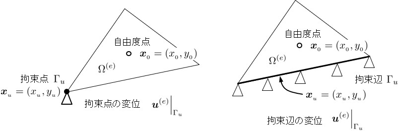 いま,変位を拘束する節点や辺の境界を $\Gamma_u$,拘束変位を $\hat{\boldsymbol{u}}$ し,境界 $\Gamma_u$ に関係する小領域 $\Omega^{(e)}$ の $\Gamma_u$ 上の変位を $\left. \boldsymbol{u}^{(e)} \right|_{\Gamma_u}$ とするとき,境界条件は,