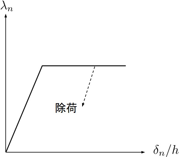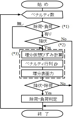 図に示す(*1)の判定は,すでに降伏状態にあるペナルティ辺か否かを判定している.降伏状態にあれば除荷が発生しない限り塑性状態を継続するものとしてフラッグの変更を行わない.もし,ペナルティ辺が降伏状態でなければ除荷状態か否かを判定し,除荷状態であれば以後弾性と見なし,フラッグを