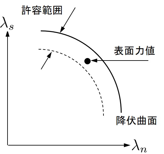 図6.7 に示すよう,ある程度許容範囲を設け,現在の表面力がそれ以上なら降伏とみなす方法をとる.山田の方法では一つ一つペナルティ辺を降伏させてゆくが,このような許容範囲を与えることで,降伏強度に非常に近い表面力を持つペナルティ辺が存在した場合,一度に何箇所か降伏することもありうる.しかし,あまり厳密に判定したとしても精度はそれほど上がらないことも多く,場合によっては解の収束性を損なうこともある.筆者らの経験では単精度の場合で0.98程度,倍精度の場合で0.998程度の設定によりあまり誤差の無い極限荷重を得ている.