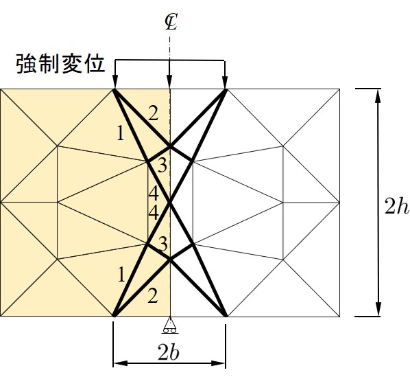 拘束条件としては,領域番号⑫の辺7-14の上下方向と,領域⑫の14-11,領域⑭の11-12,領域⑯の12-13,領域⑱の13-15の左右方向を拘束する.また.領域⑱における辺10-15に下向きの強制変位として