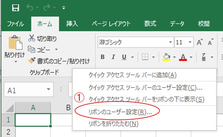 - ① リボン上の任意の位置でマウスの右ボタンをクリックし,図1-1に示すメニューウィンドウが表示されたら「リボンのユーザー設定」を選択する.