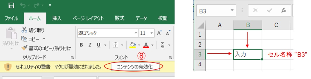 - (注2)マクロを含むブックを開いたときにリボンとワークシートの間に「セキュリティの警告: マクロが無効にされました」というバーが表示される場合は,「コンテンツの有効化」ボタンをクリックしてマクロを有効にする.