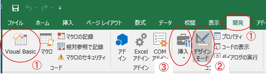 - ① VBEを起動するためには,図1-5に示すExcel画面において,リボンの「開発」タブをマウスを用いて選択する.