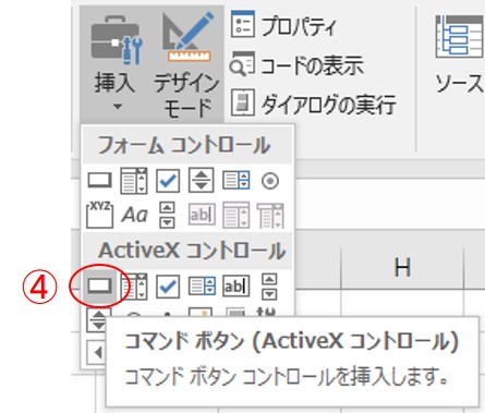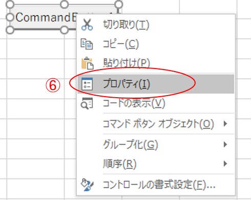 - ⑥ 作成したCommandButton1にマウスカーソルを移動し,右クリックすると,図1-20に示すメニューが表示されるので,メニューから「プロパティ」を選択する.