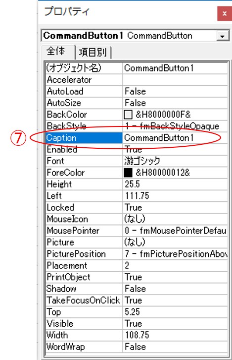 - ⑦ 図1-21に示すように,CommandButton1に関するプロパティが表示されるので,「Caption」を選択して変更する.その他,ボタンに関する様々な情報をここで編集することができる.