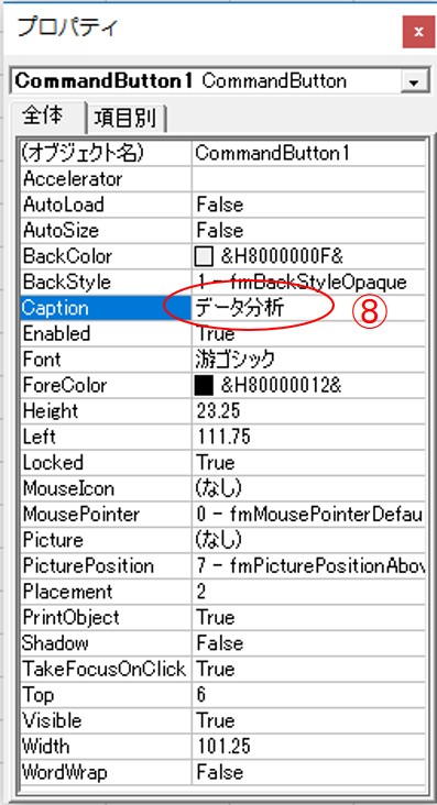 - ⑧ 図1-22に示すように,「Caption」を「データ分析」に変更する.この時,ボタンのCaptionが,