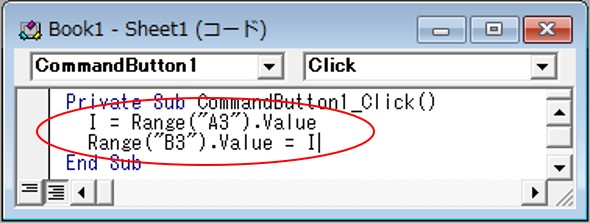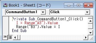 - ⑪ 図1-25に示すプログラムを入力する.このマクロは,ボタンが押されるとセルA3の値がセルB3に表示されるプログラムである.