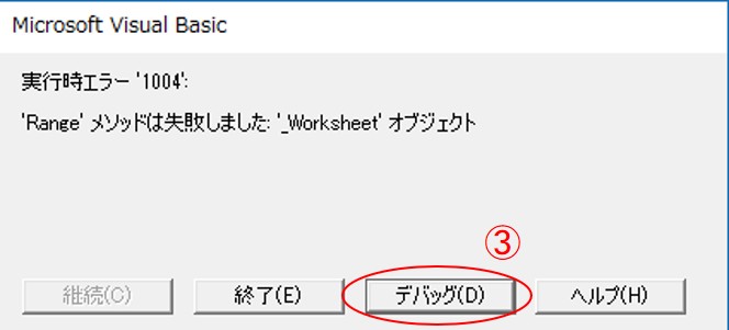 - ③ デザインモードを終了し,セルA3に値を入力した後,ボタンをクリックすると,図1-28のメッセージボックスが表示されるので,「デバック」ボタンをクリックする.