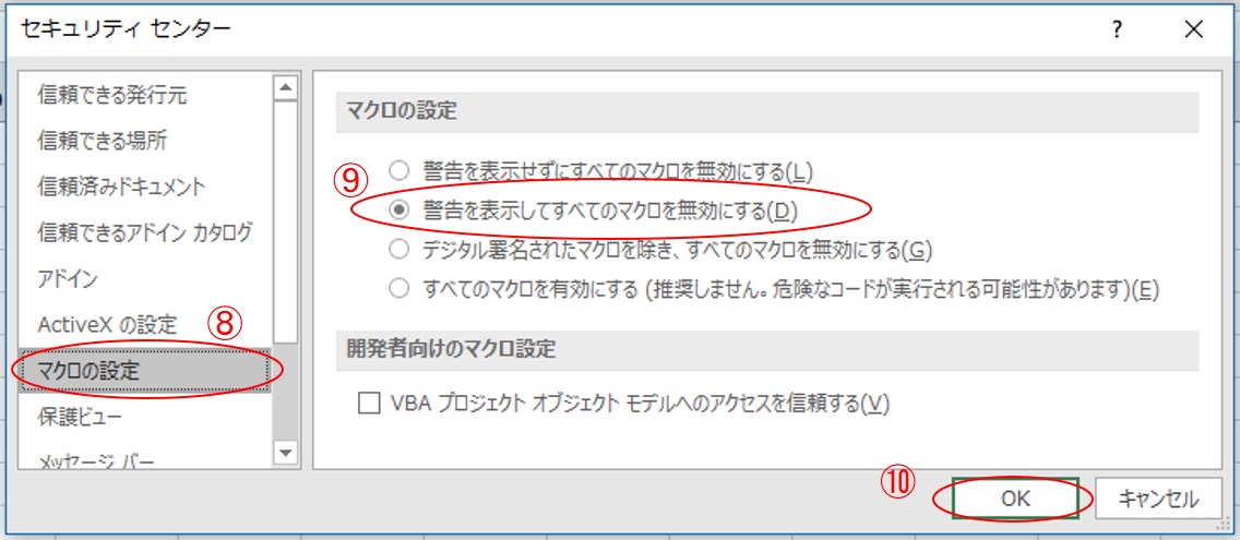 - ⑨ 「警告を表示してすべてのマクロを無効にする」を選択する.