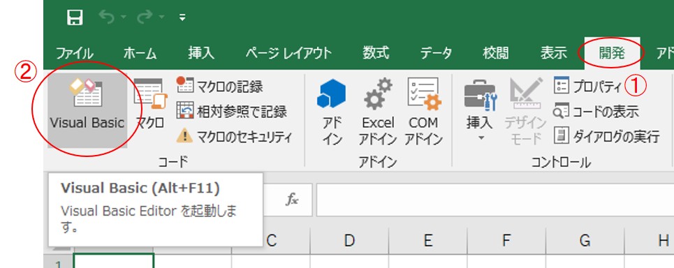 - ① リボンから「開発」タブを選択し,左端の「Visual Basic」を選択する.