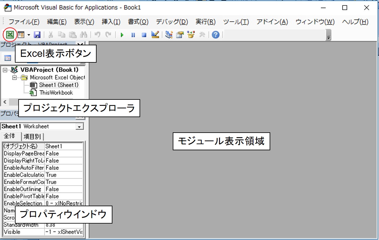 - ① 「1-2節」の手順①②にしたがってVBEのウィンドウを表示する.
