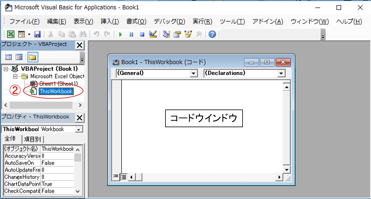 - ② 図1-7に示すように「This Work Book」をダブルクリックしてWorkBookに対応するコードウィンドウを表示する.