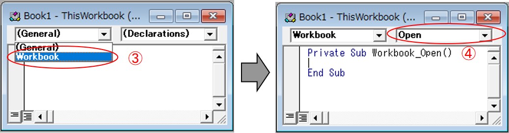 - ③ 図1-8左に示すようにコードウィンドウのオブジェクトボックスから「Workbook」を選択する.